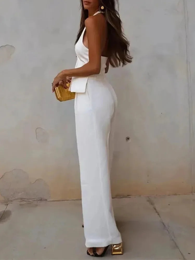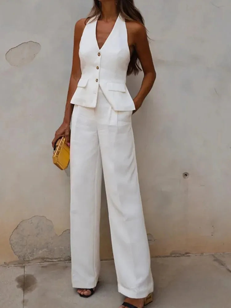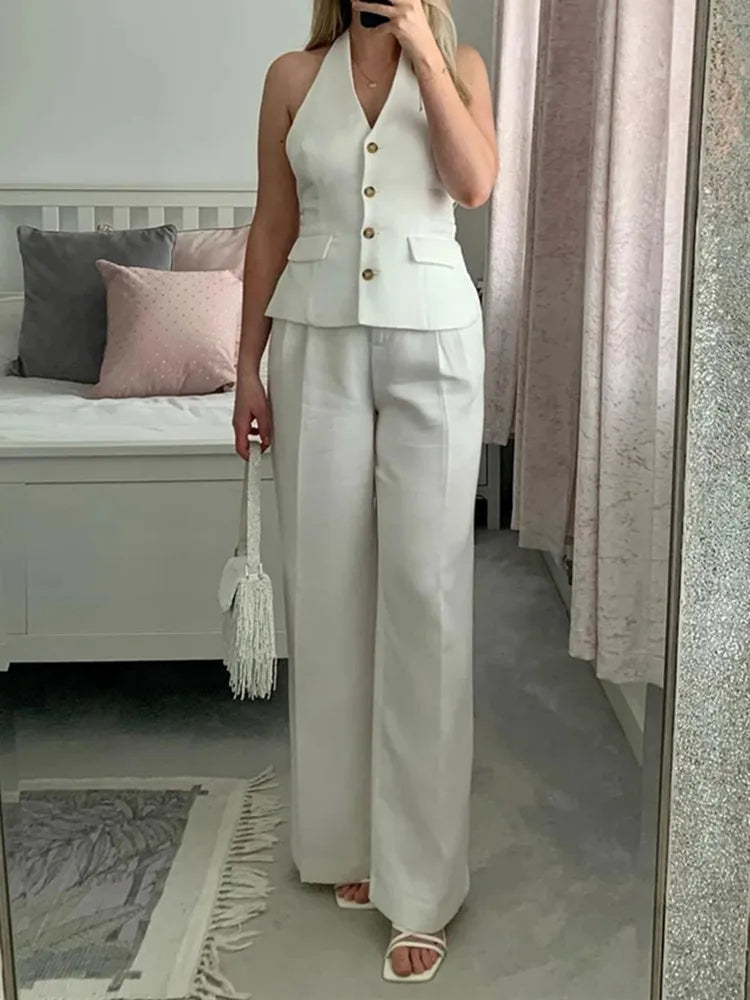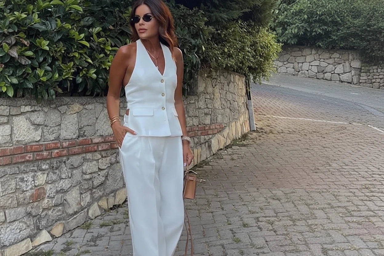 Top: Chaleco sastrero corto (Crop) con escote en V y botonadura simple.