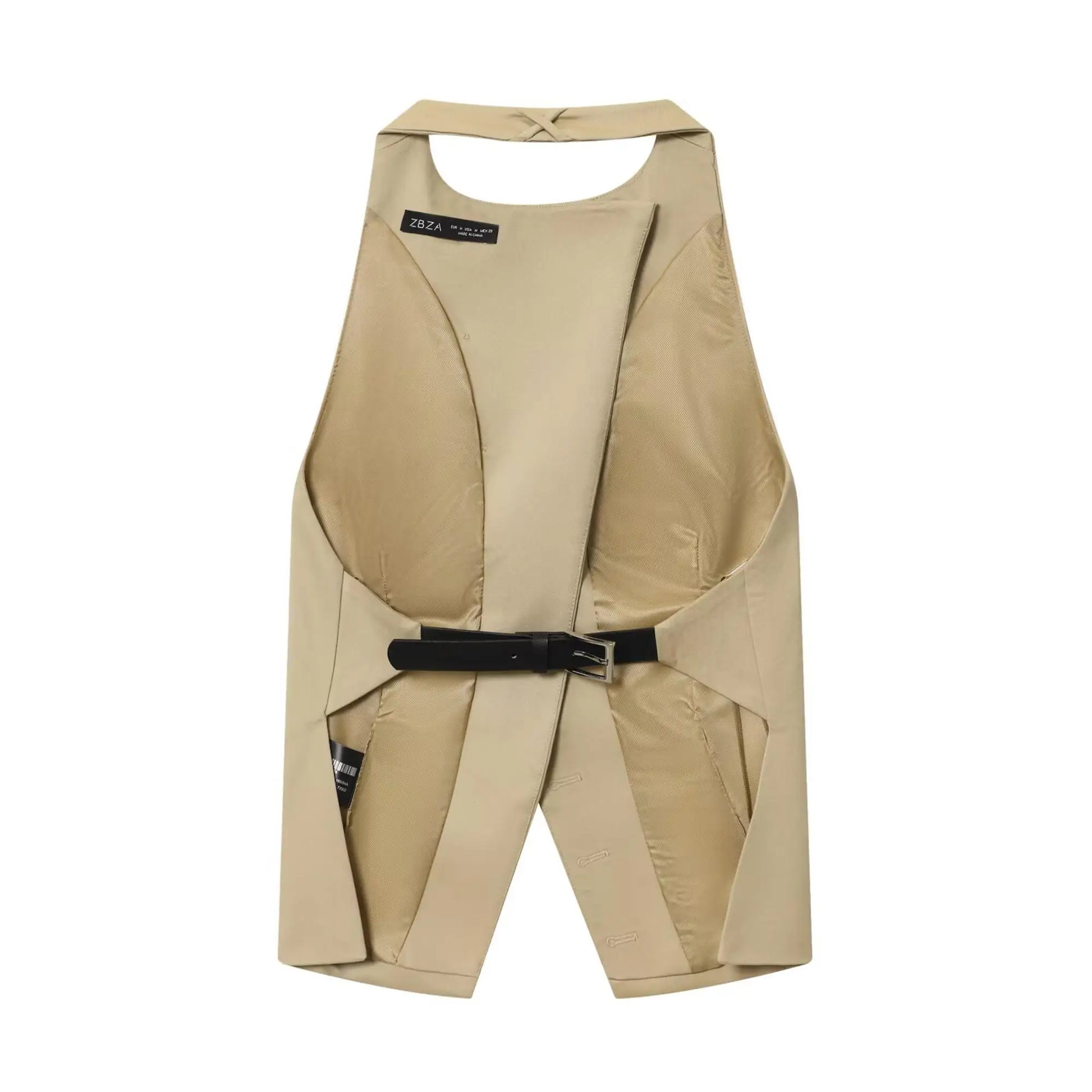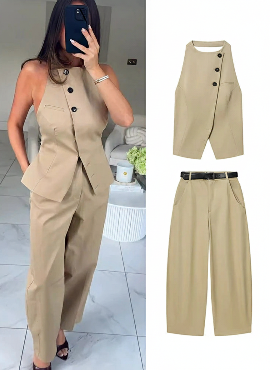 Diseño: Set coordinado de 2 piezas con Top Halter de espalda descubierta (Backless) y Pantalón Recto de frente plano con cinturón.